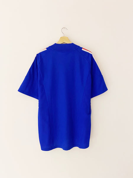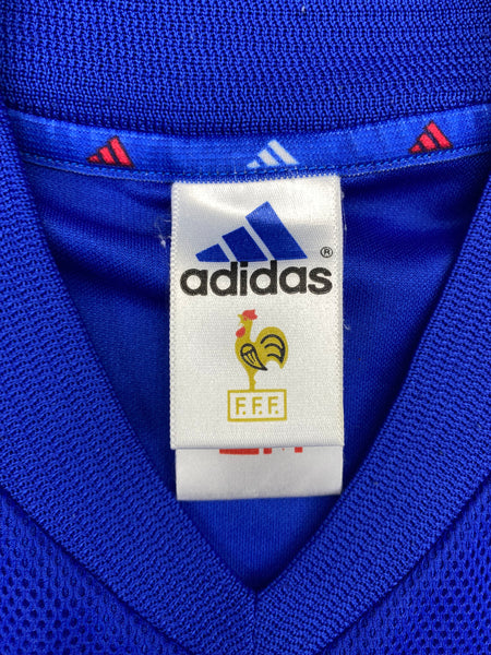 INFO – Home shirt as worn by France at the 2002 World Cup as the holders surprisingly finished bottom of Group A after failing to win a game. The shirt was also worn as France won the 2003 Confederations Cup. Players in the squad included Henry, Trezeguet, Thuram, Desailly, Vieira, Lizarazu
