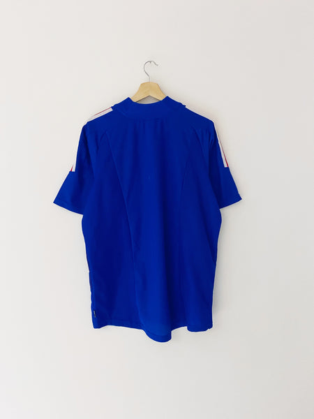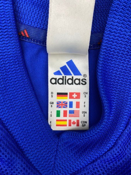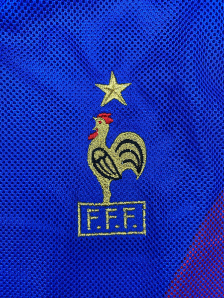 INFO – Home shirt as worn by France at the 2002 World Cup as the holders surprisingly finished bottom of Group A after failing to win a game. The shirt was also worn as France won the 2003 Confederations Cup. Players in the squad included Henry, Trezeguet, Thuram, Desailly, Vieira, Lizarazu
