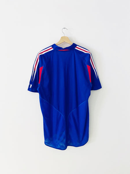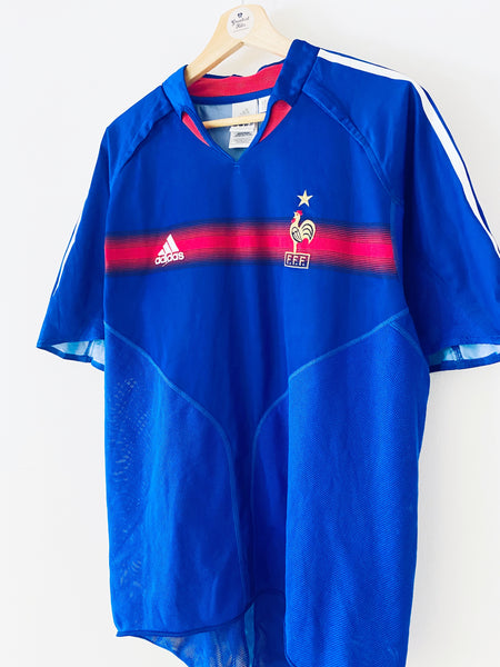 INFO – Home shirt as worn at Euro 2004 as France suffered a shock quarter final defeat to eventual winners Greece. Players in the squad included Zidane, Viera, Pires, Makelele, Henry