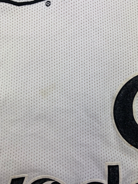CONDITION - Very good. White side - Nice material feel with bright colours. One tiny faint mark near sponsor. Gold side - Nice material feel with bright colours. Noticeable wear to sponsor. Slight discolouration to club crest. A few tiny pulls. Overall 7/10