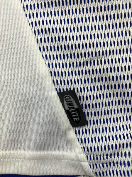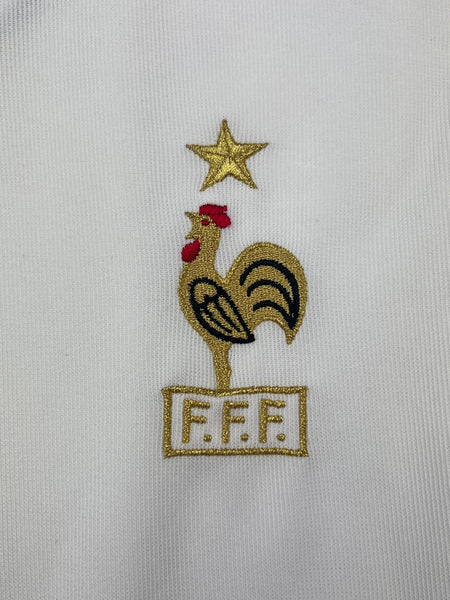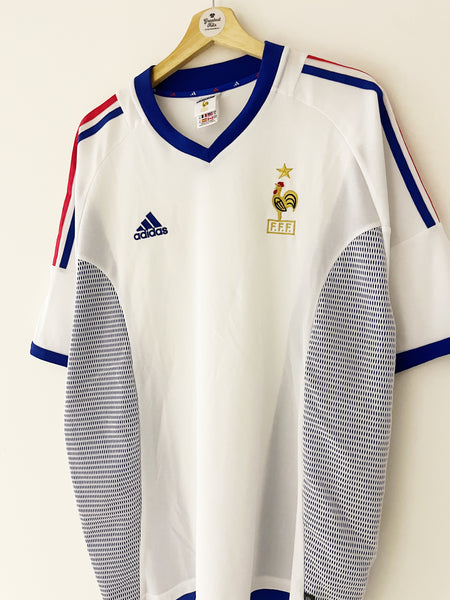 INFO – Away shirt as worn by France at the 2002 World Cup as the holders surprisingly finished bottom of Group A after failing to win a game. The shirt was also worn as France won the 2003 Confederations Cup. Players in the squad included Henry, Trezeguet, Thuram, Desailly, Vieira, Lizarazu