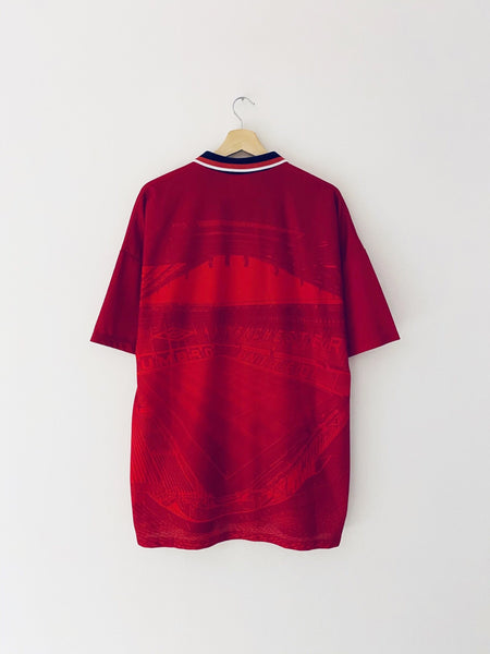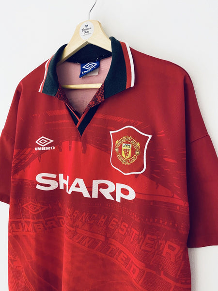 INFO - Home shirt as worn as Man Utd won the ‘95/96 Premier League, pipping Newcastle to the title by 4 points. Players to wear the shirt include Cantona, Keane, Irwin, McClair, Pallister, Ince