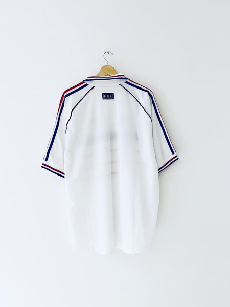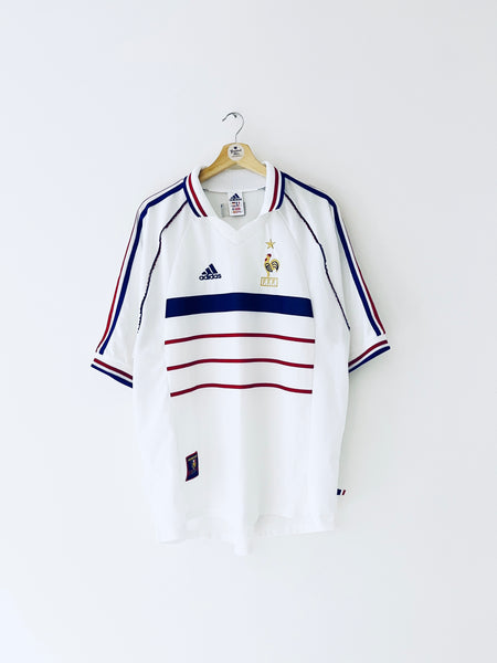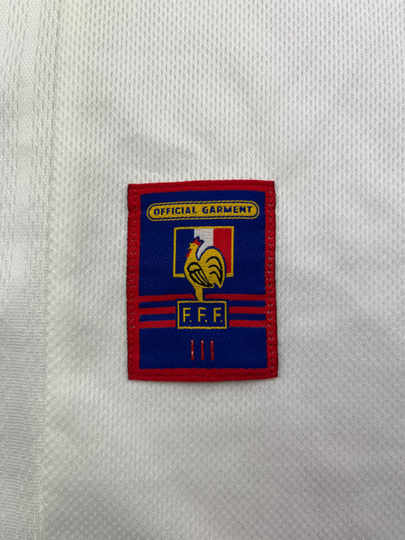INFO – Rare Away shirt as worn as France hosted and won the ‘98 World Cup, beating Brazil 3-0 in the final. Players in the squad included Petit, Vieira, Deschamps, Blanc, Leboeuf, Zidane