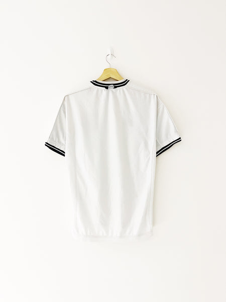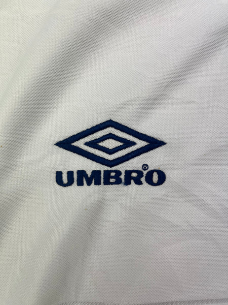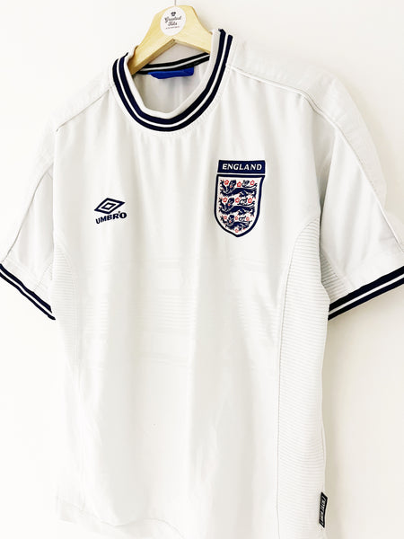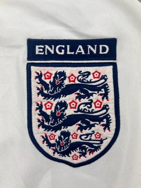 INFO – Home shirt as worn when England qualified for Euro 2000 after beating Scotland in a play-off. England failed to escape from a very tricky group at Euro 2000. Players in the squad included Scholes, McManaman, Shearer, Redknapp, Campbell, Ince