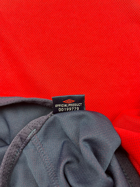 CONDITION - Very good. Nice material feel with bright colours. Red side: Team crest and Umbro logo are pristine, several tiny pulls. Blue side: Minimal fade to the crest. Umbro logo is pristine. Size label has been removed (pit to pit measures 25”). Overall 8/10