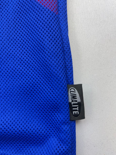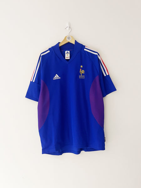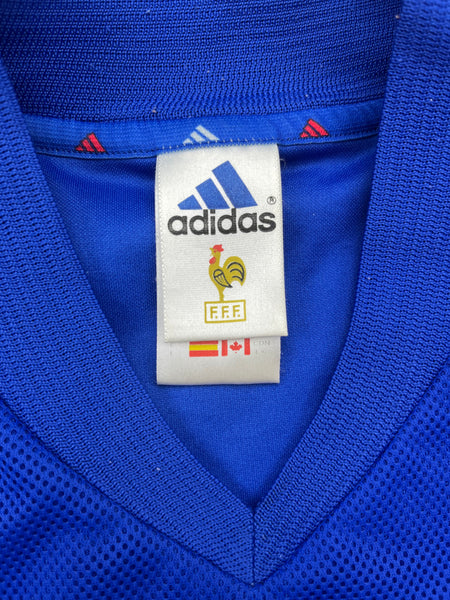 INFO – Home shirt as worn by France at the 2002 World Cup as the holders surprisingly finished bottom of Group A after failing to win a game. The shirt was also worn as France won the 2003 Confederations Cup. Players in the squad included Henry, Trezeguet, Thuram, Desailly, Vieira, Lizarazu