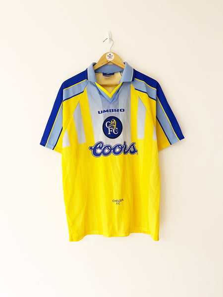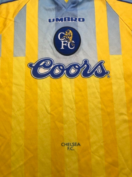 INFO – Away shirt as worn as Chelsea finished 6th in the Premier League and won the FA Cup under player-manager Ruud Gullit. Players in the squad included Wise, Hughes, Leboeuf, Petrescu, Zola, Di Matteo