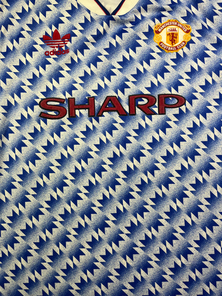 INFO – Super collectible ‘Snowflake’ Away shirt as worn under manager Alex Ferguson as Man Utd won the ‘90/91 Cup Winners’ Cup, and the League Cup in the following campaign. Players in the squad included Bruce, Pallister, Robson, Hughes, McClair, Ince