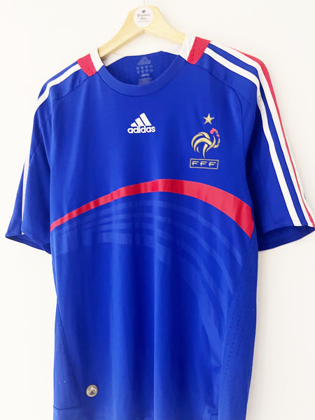 INFO – Home shirt as worn at Euro 2008 as France were surprisingly knocked out in the group stages after losing to Italy and Holland. Players in the squad included Henry, Ribery, Vieira, Benzema, Evra, Malouda