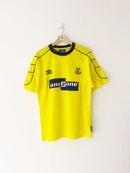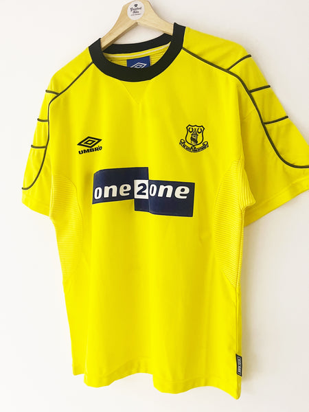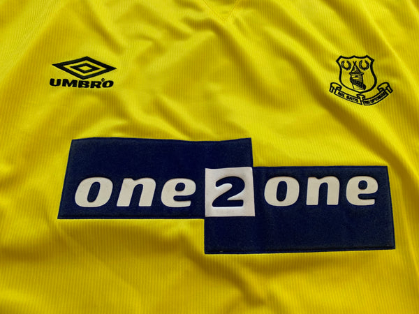 INFO – Away shirt as worn in the ‘99/00 season which saw Everton finish 13th in the Premier League under manager Walter Smith. They also reached the quarter finals of the F.A Cup. Players in the squad included Watson, Barmby, Unsworth, Jeffers, Moore, Campbell