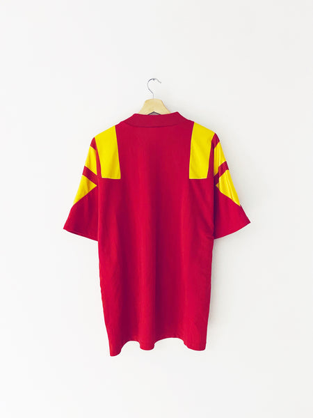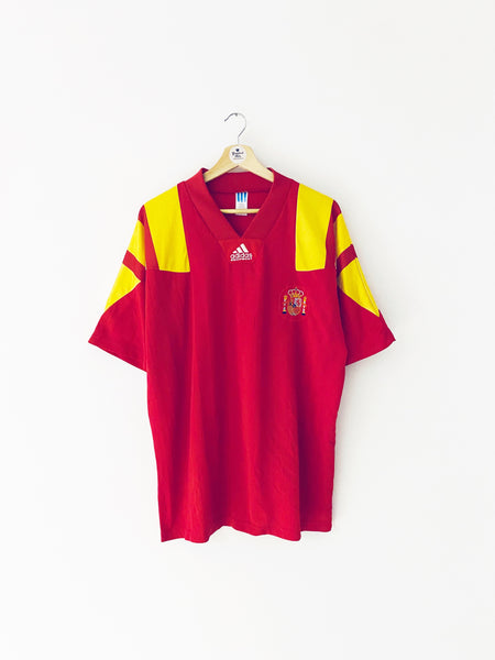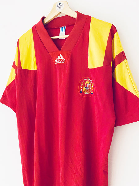 INFO - Rare Home shirt as worn by Spain as they successfully qualified for the 1994 World Cup after topping their group. Players in the squad included Guardiola, Nadal, Bakero, Salinas